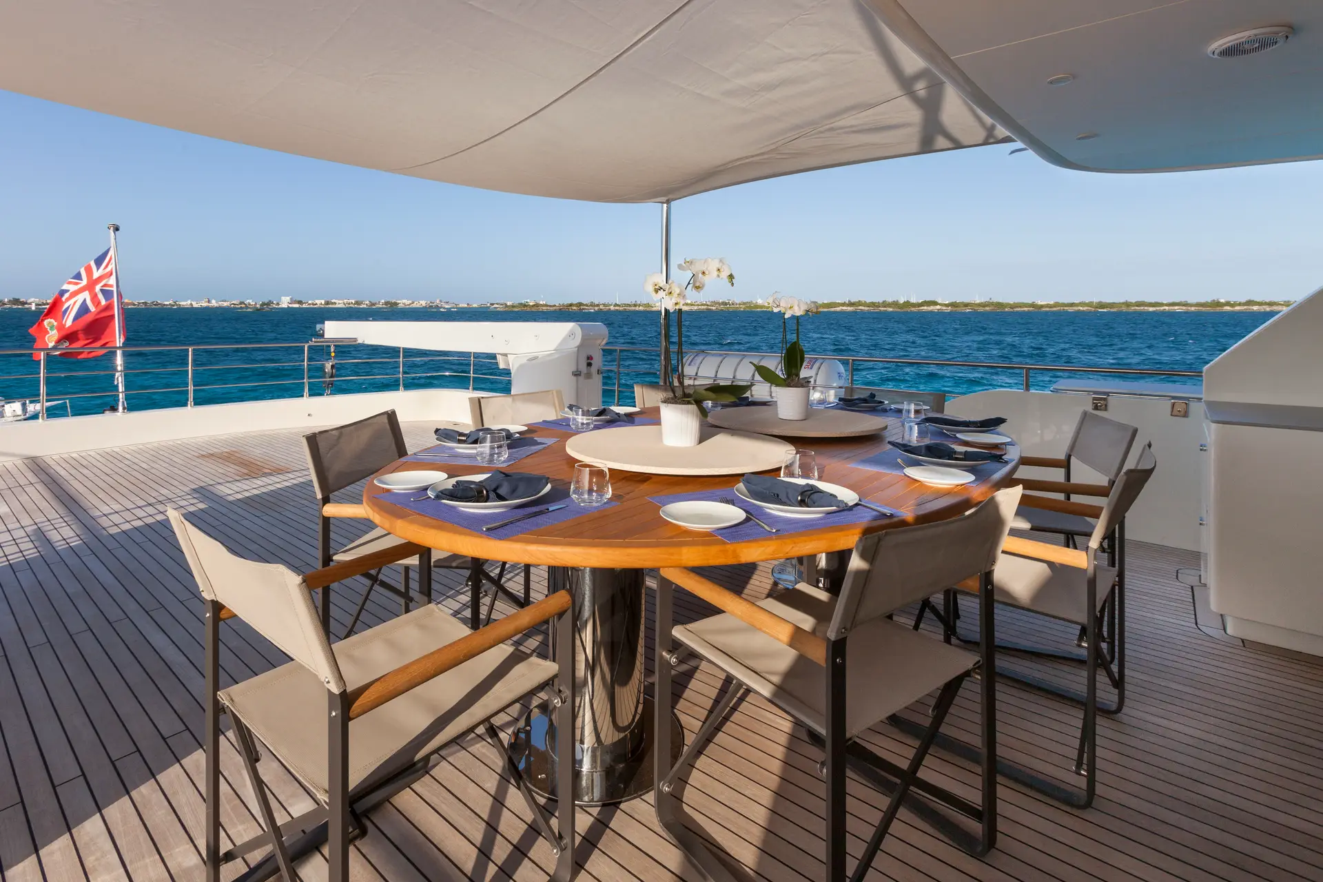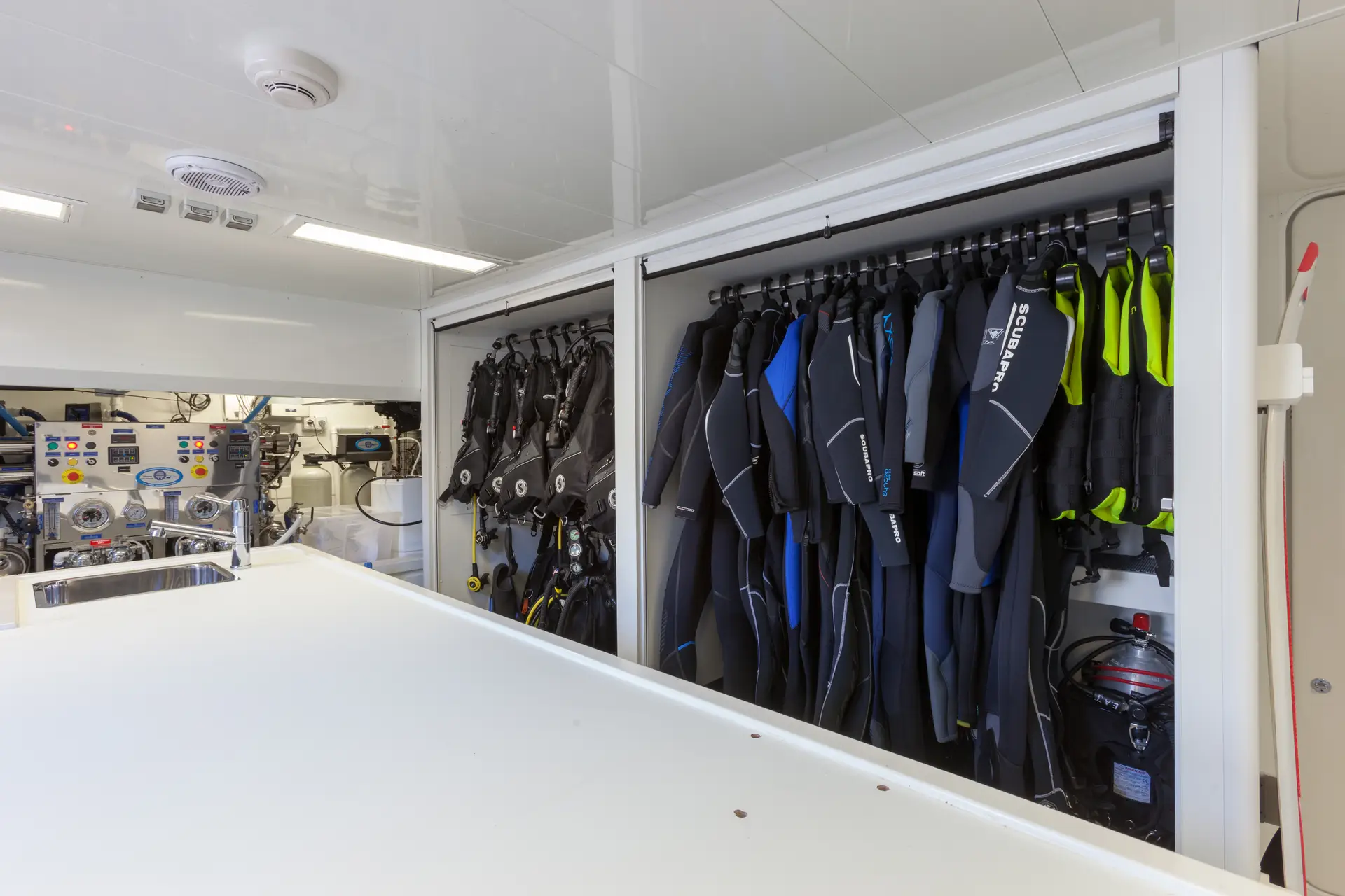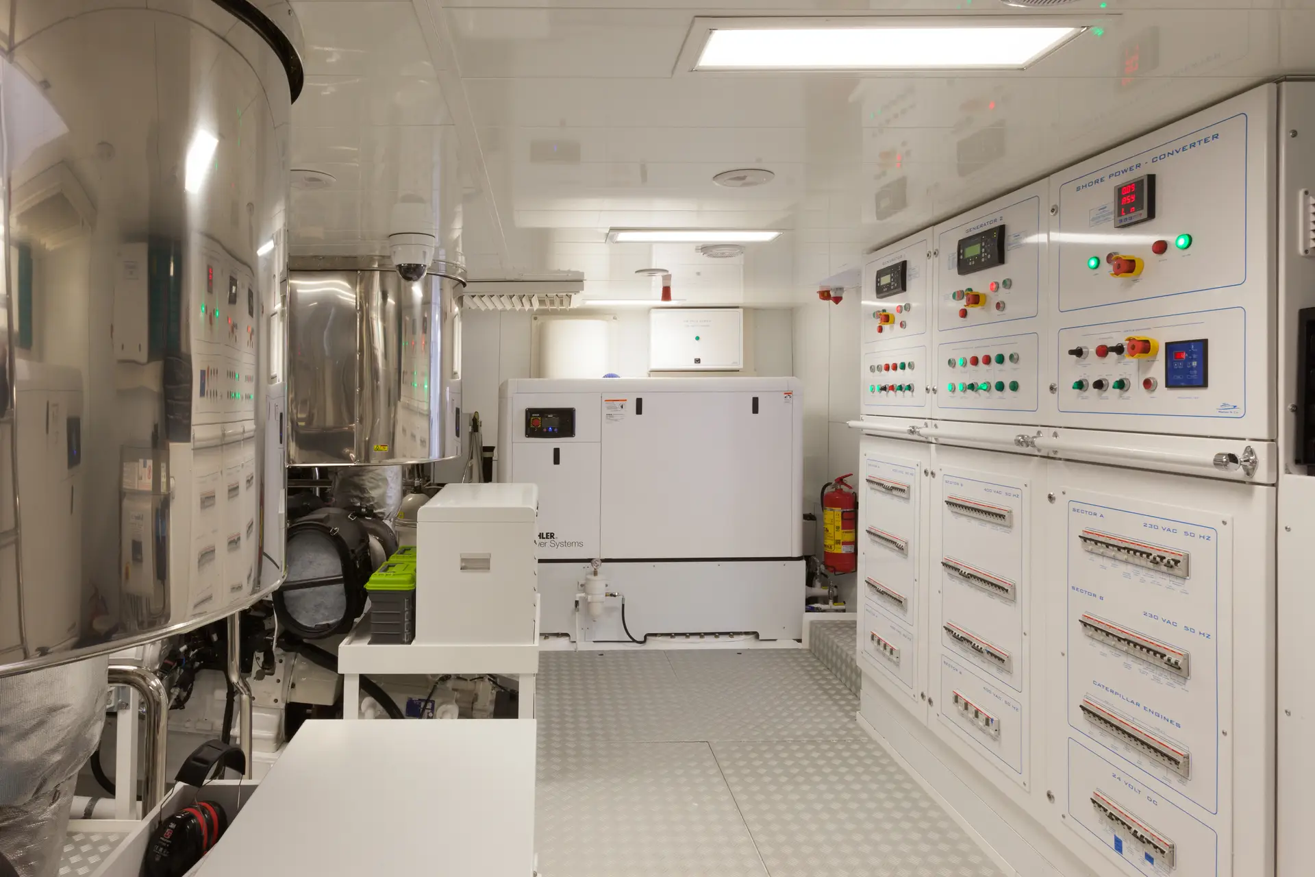 Acala’s exterior design by HydroTec delivers both capability and style. Her steel hull supports long‑range voyaging, while the aluminium superstructure cuts weight above deck. Walk‑around decks and a spacious sun deck provide multiple zones for lounging and socialising, including a jacuzzi and sun‑pads. Under her large swim platform lies a deep lazarette customised for diving gear and tenders, enhancing her adventure credentials. With a draft of just 2.3 m (7’7”), she offers access to shallower anchorages than many explorer yachts in her class.