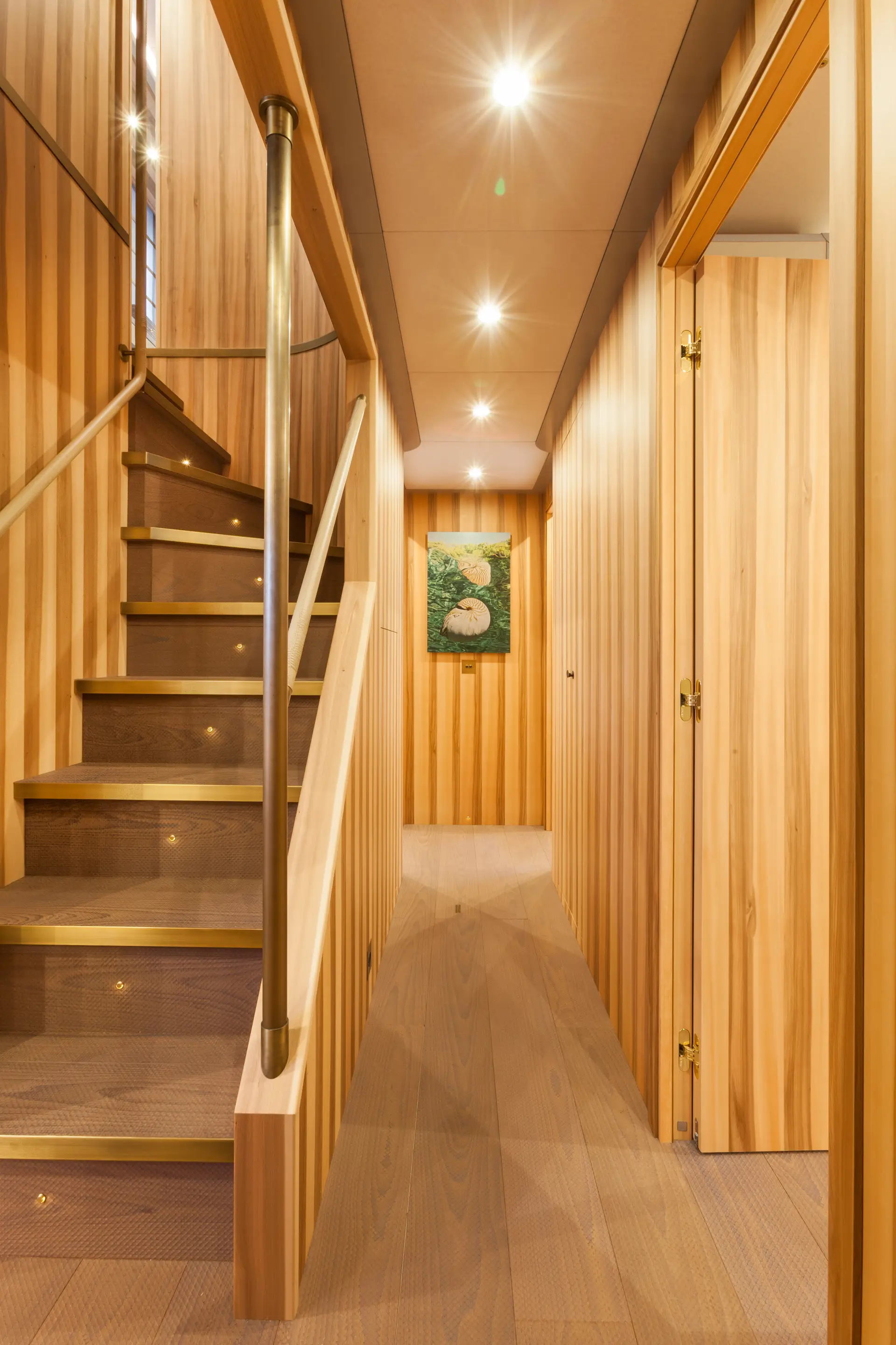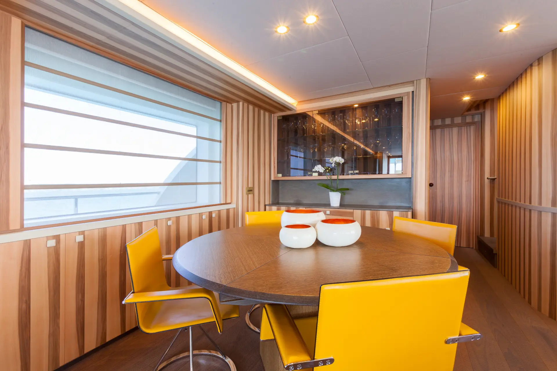 Interior styling by Simon Hamui brings an elegant yet purposeful aesthetic to Acala. Rich walnut, hand‑stitched leathers, refined hardware and high‑quality fabrics are paired with clever layout design to support both laid‑back and formal living. Five guest cabins on the lower deck include a forward master suite, two VIP doubles aft and two twin cabins amidships, comfortably accommodating up to 12 guests. The salon flows into dining and social areas, while large windows, climate‑controlled outdoor lounge spaces and seamless interior‑exterior transitions elevate the onboard experience.