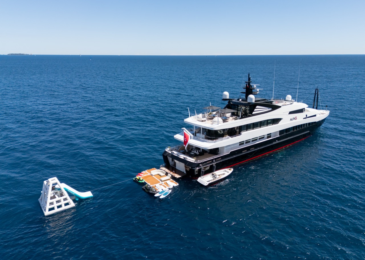 In 2024, *Alfa G* benefitted from a €20m capital investment and underwent a stem to stern refit. The extensive renovation was held in collaboration with Oceanco and G&K yachting S.A. with all systems overhauled and the most modern technologies implemented. There was also a complete cosmetic facelift, totally modernising the aesthetic.In addition to all new technical systems, the extensive renovation included a full repaint, new teak decks, new mast and a new aft terrace. The newly improved aft terrace on the sundeck features adjustable dining tables that can be arranged as a single long table or split into two, offering flexibility for dining arrangements. This area also includes two large "cocoons" with windbreaks, as well as a spacious bar and BBQ setup, providing the perfect backdrop for alfresco dining with panoramic ocean views. One of the yacht's standout features is the stunning swimming pool on the sundeck. The pool is equipped with a state-of-the-art counter-current training system and jacuzzi function. Surrounding the pool is an expansive sun lounging area, ideal for unwinding or hosting social gatherings in an atmosphere of sheer indulgence.