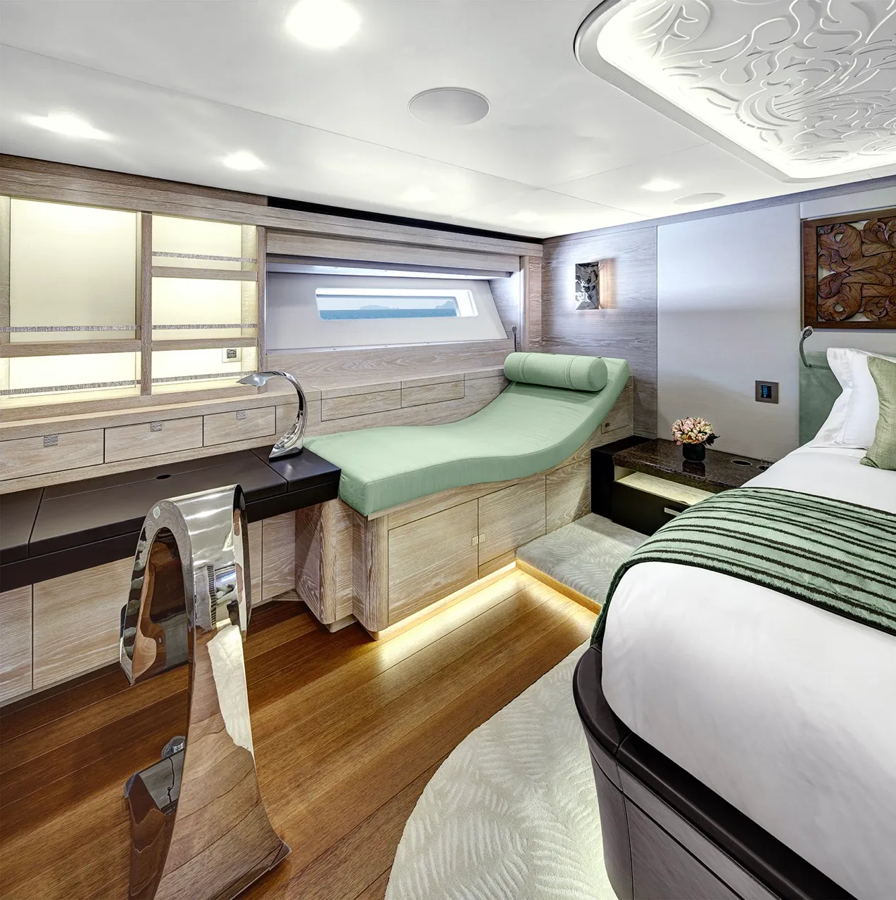 The interior of Escapade reflects a sophisticated and culturally enriched aesthetic, courtesy of Design Unlimited. The deck saloon is bathed in natural light through expansive glazing, enhancing the warm tones of the Merbau timber flooring. To port, a comfortable lounge area invites relaxation, while to starboard, a feature bar adorned with back-lit agate serves as a focal point for social gatherings. Malaysian design influences are evident throughout, with Songket silk panels and hand-carved teak sculptures adding an exotic touch. Accommodation is configured for flexibility and comfort, featuring an aft full-beam owner's suite with an island double berth, a sofa, vanity, walk-in wardrobe, and en-suite shower room. Two convertible twin cabins, each with an additional Pullman berth and en-suite facilities, cater to varying guest needs. A fourth cabin forward serves dual purposes as a day room or additional guest accommodation, ensuring versatility for different cruising requirements.