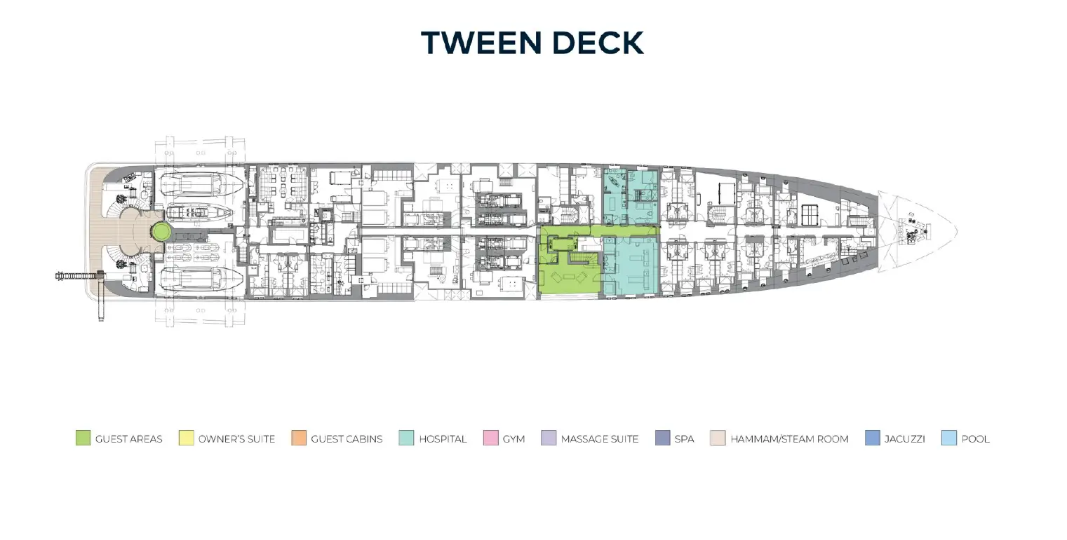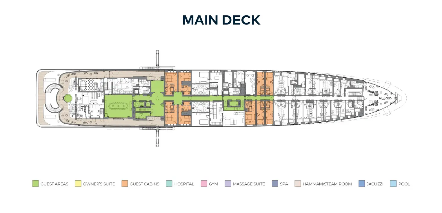 Inside Golden Odyssey, every detail emphasises luxury, scale and comfort. The owner’s deck boasts two master suites along with two VIP suites, each with private terraces. A dedicated spa & wellness area with hammam, steam room and treatment room complements expansive lounges, a gym, and a beach club at water level. Interiors feature rich materials, elegant décor and bespoke design touches, creating a refined living environment for guests seeking both relaxation and grandeur. With the versatile 15‑cabin layout, she can host large parties or extended family groups with equal ease.