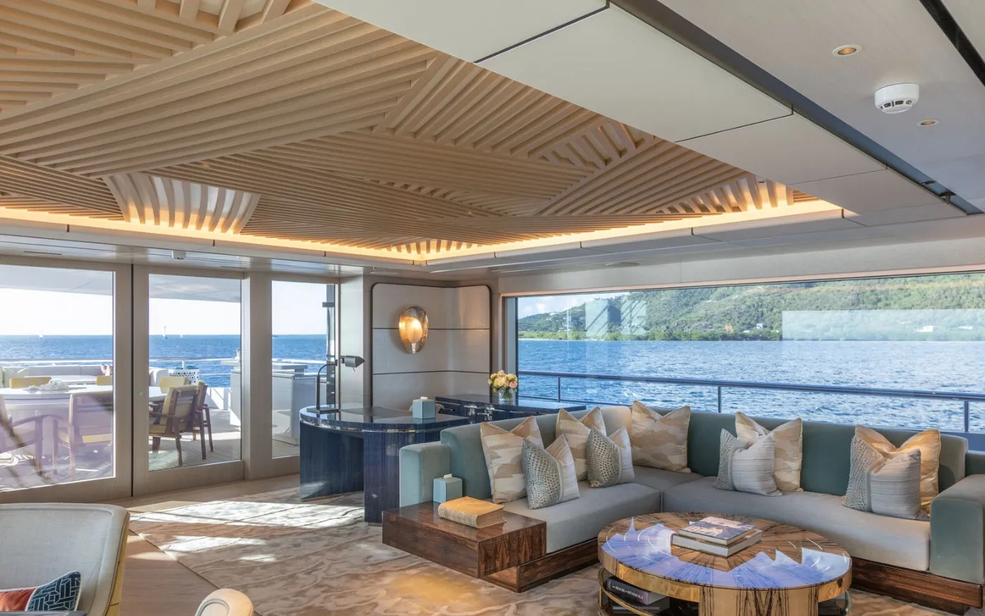 Inside, "Moon Sand" reveals a stunning interior by Bannenberg & Rowell that combines luxury with an inviting atmosphere. Every detail, from the plush furnishings to the bespoke art pieces, reflects a commitment to refinement and quality. The main salon offers panoramic views through floor-to-ceiling windows, while the formal dining area is perfect for hosting intimate gatherings. The owner’s suite is a private haven, featuring an en-suite bathroom, walk-in wardrobe, and separate lounge. Guest cabins are equally luxurious, providing ample space and comfort. Cutting-edge technology enhances the onboard experience, including sophisticated lighting systems and top-of-the-line audio-visual equipment.
