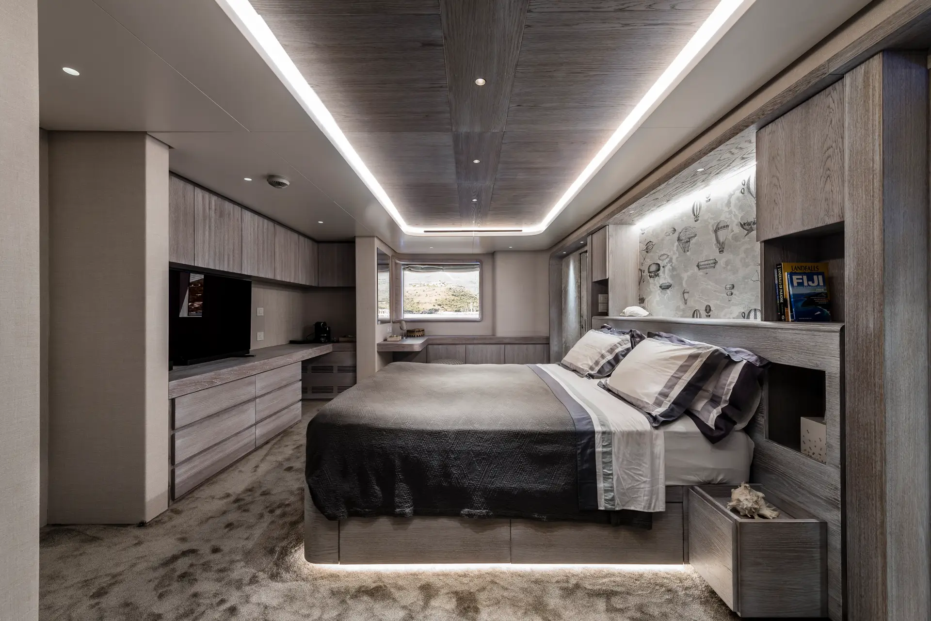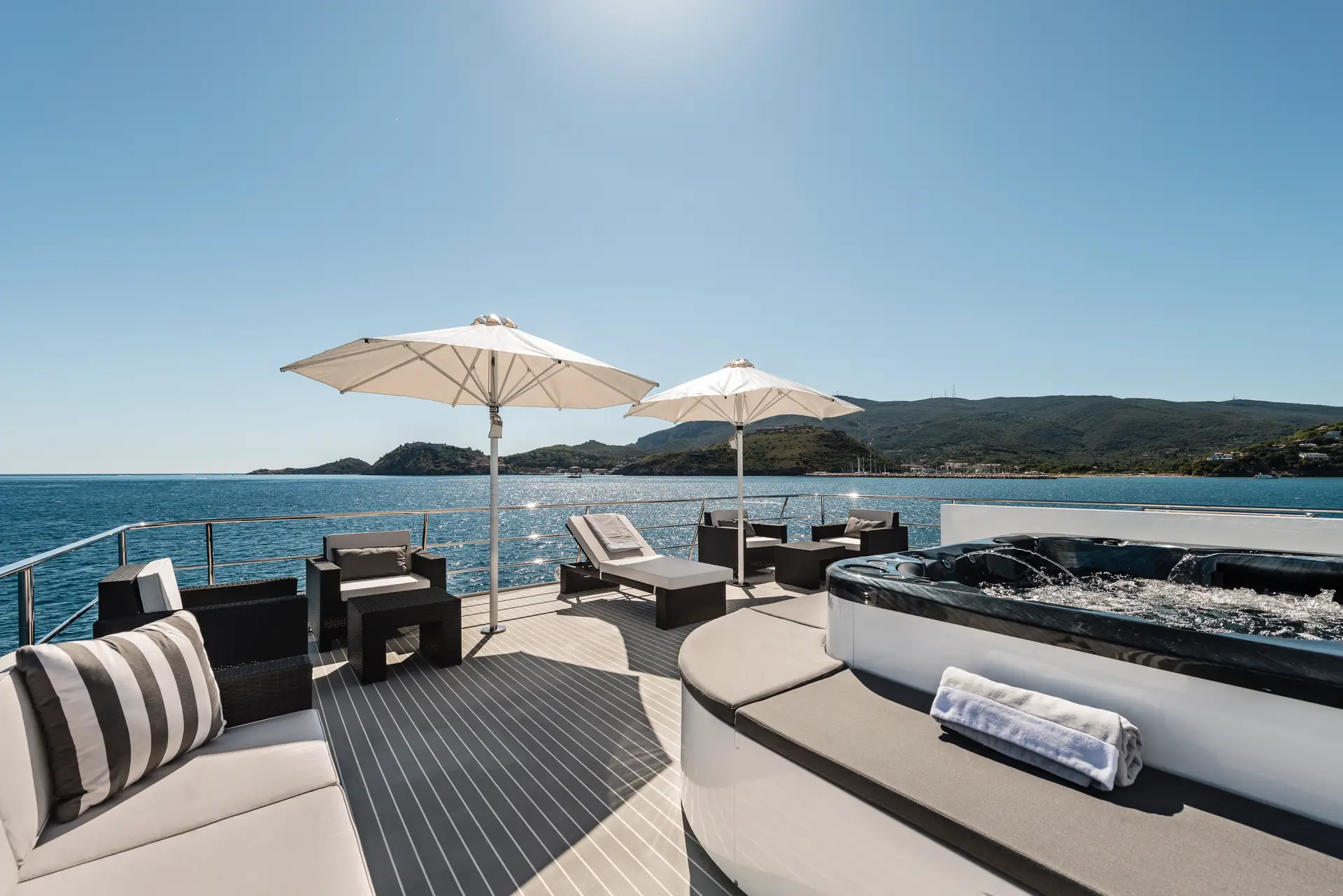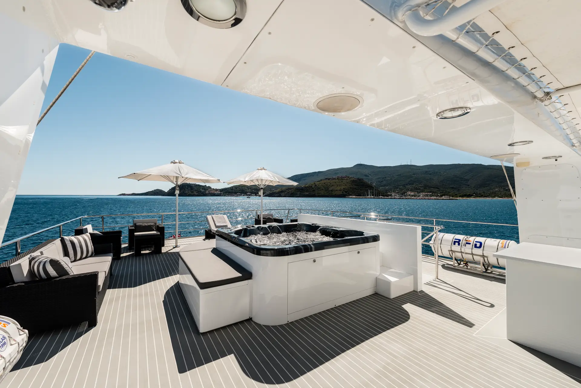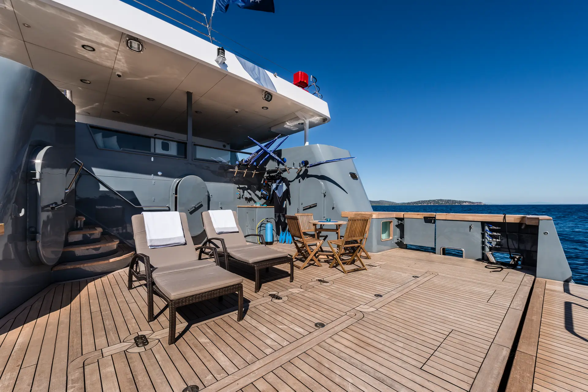 OURWAY shows her naval heritage in every line. Her steel hull (exterior design by Tenix Defence) is set deep and strong, with large fin stabilizers (at zero speed and underway) to ensure stability in rough seas. Deck space is generous across all levels: a sundeck with a hot tub, sun loungers, and an alfresco dining area; the bridge deck with lounge/dining areas; and a major highlight, her 7 m “beach club” for diving, swimming or fishing. The exterior layout feels purposeful yet comfortable, intended to work in remote or wild settings while still delivering leisure amenities. A large crane and huge deck space ensure you can carry all your toys with ease.