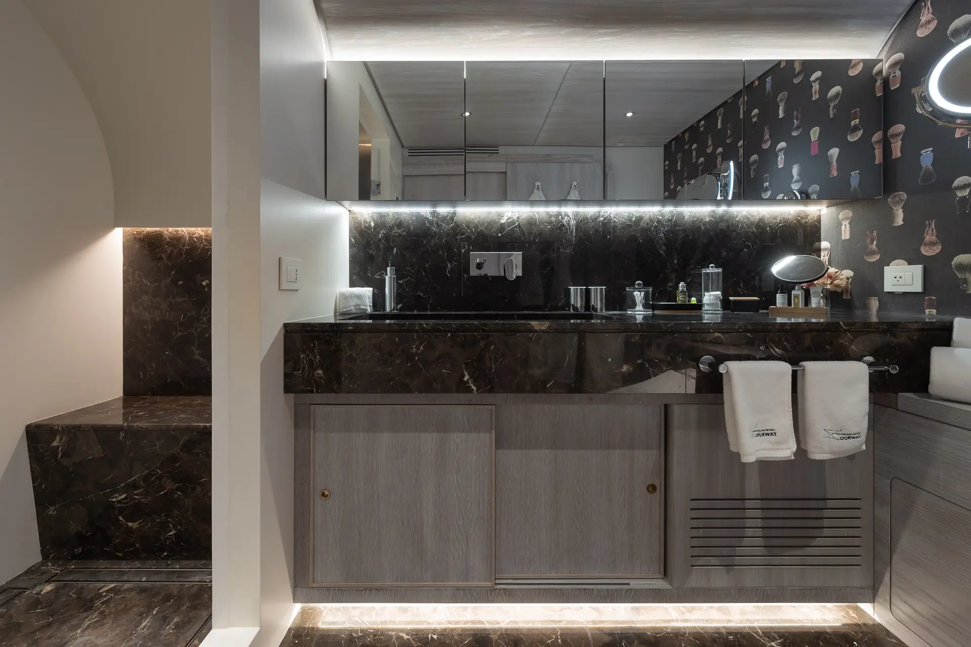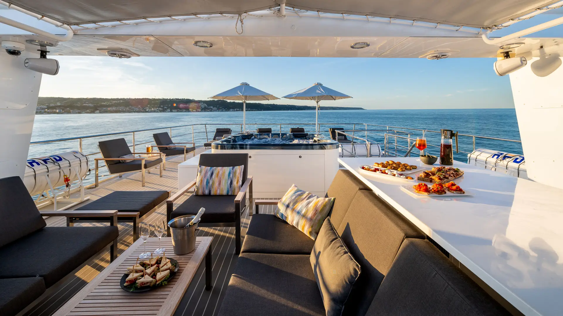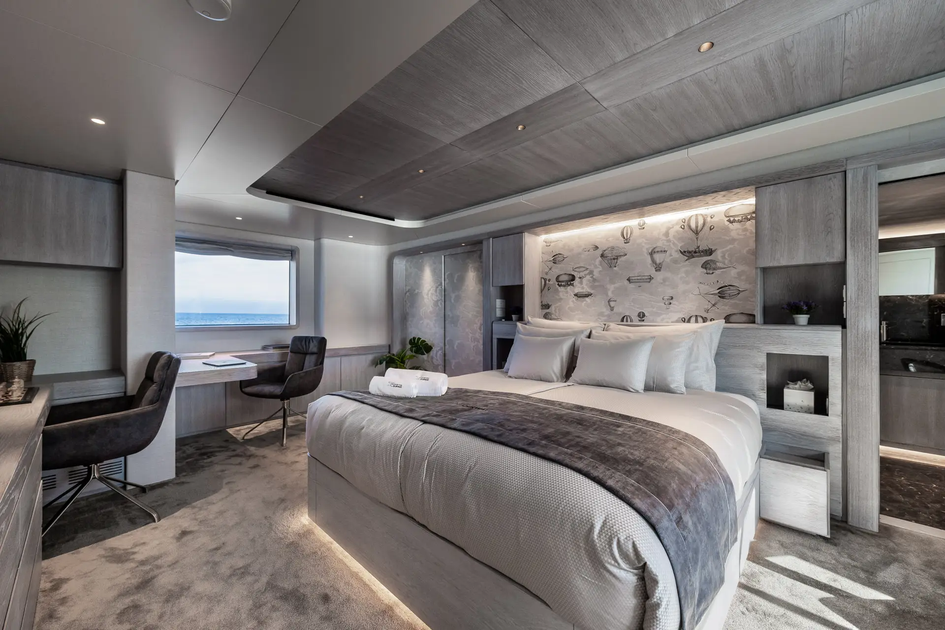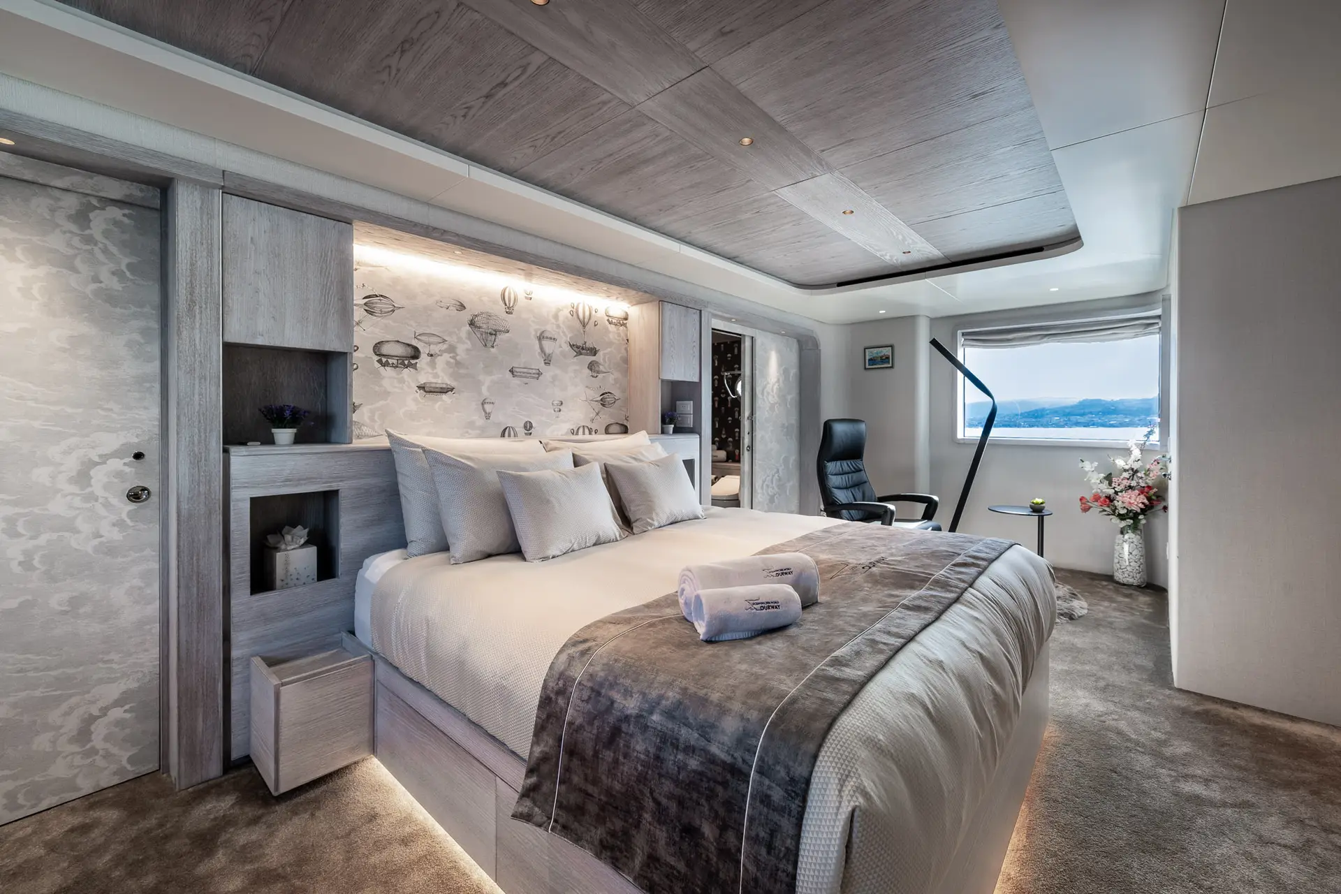 OURWAY shows her naval heritage in every line. Her steel hull (exterior design by Tenix Defence) is set deep and strong, with large fin stabilizers (at zero speed and underway) to ensure stability in rough seas. Deck space is generous across all levels: a sundeck with a hot tub, sun loungers, and an alfresco dining area; the bridge deck with lounge/dining areas; and a major highlight, her 7 m “beach club” for diving, swimming or fishing. The exterior layout feels purposeful yet comfortable, intended to work in remote or wild settings while still delivering leisure amenities. A large crane and huge deck space ensure you can carry all your toys with ease.