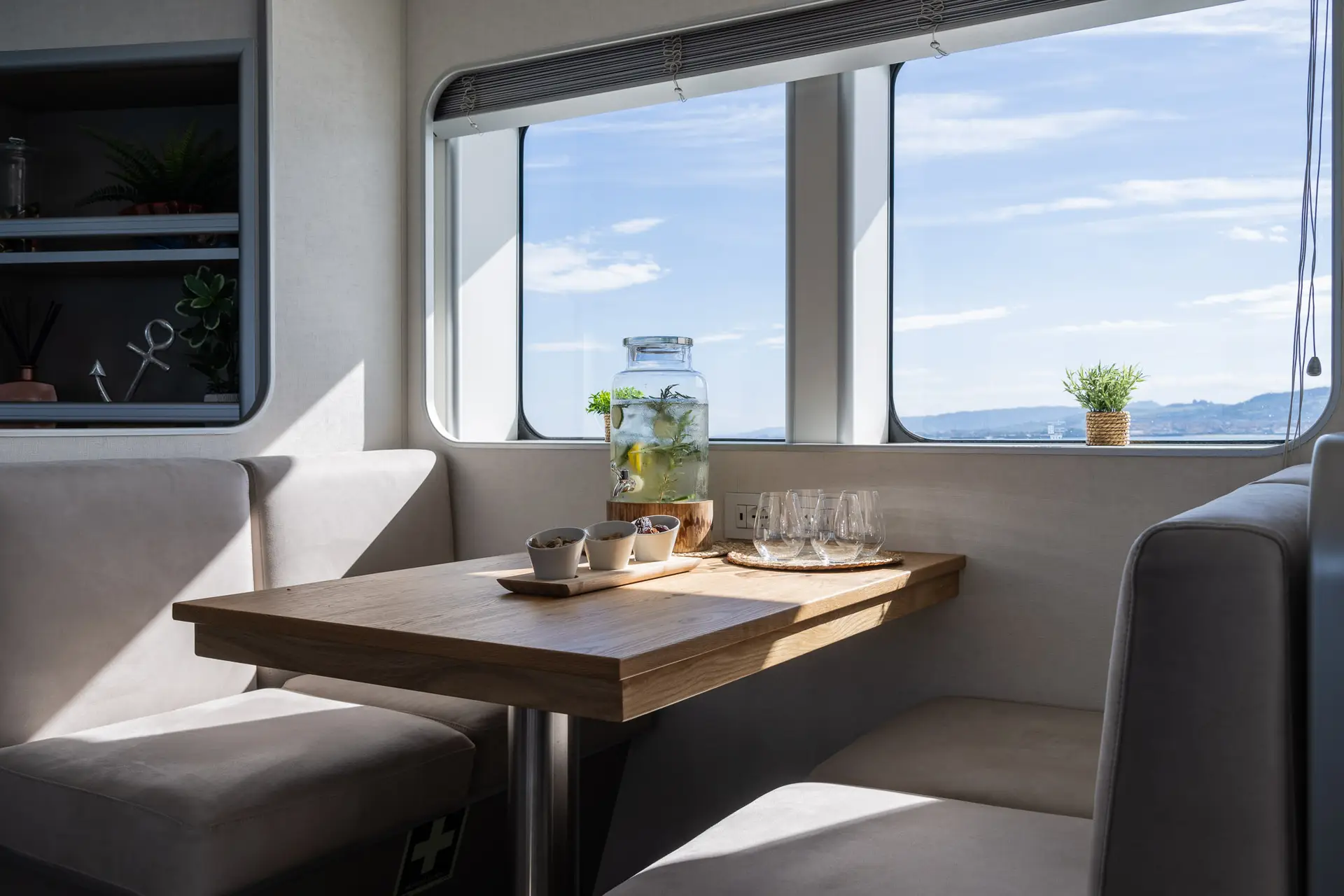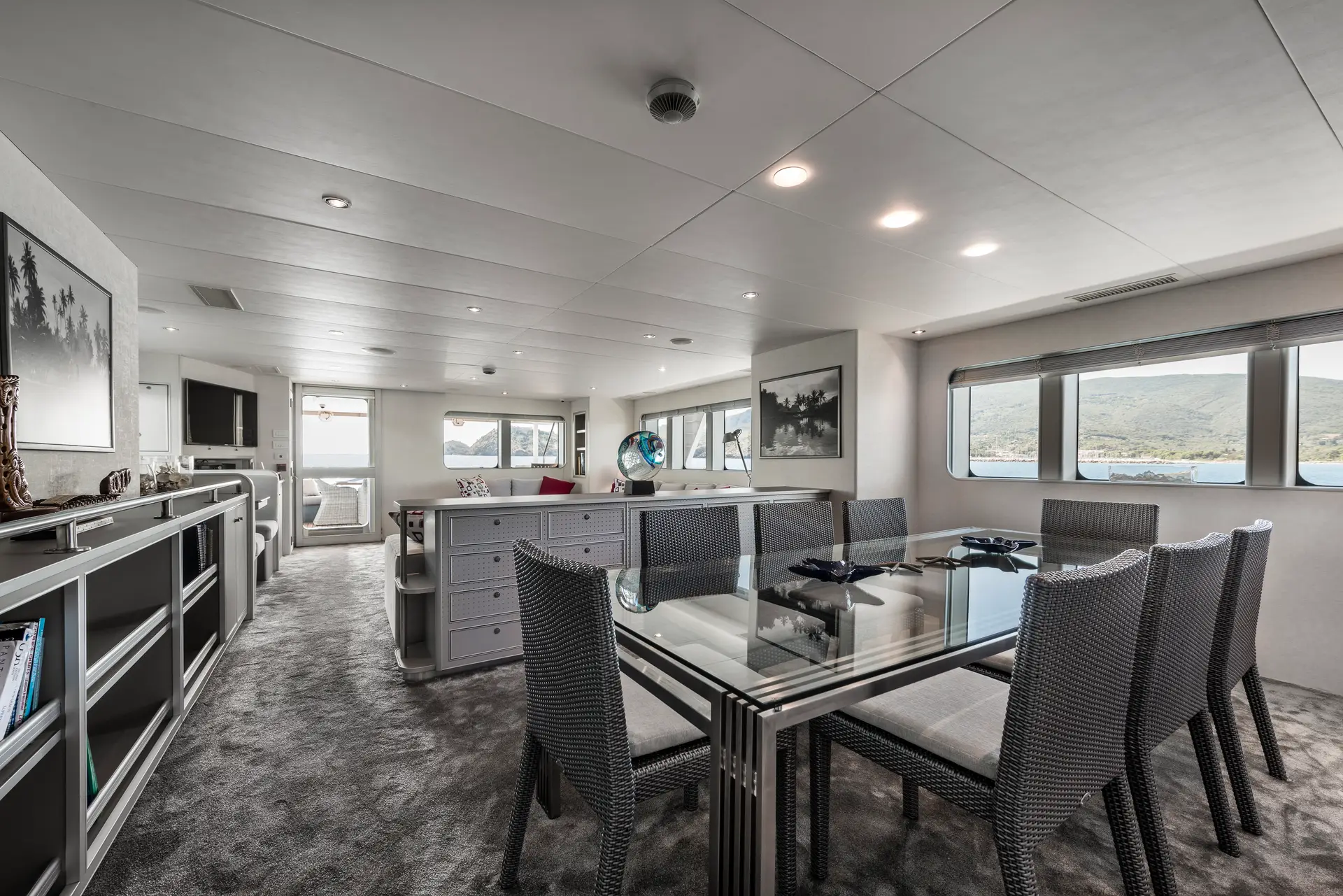 The interior was fully rebuilt as part of the 2020 refit, delivering essentially new amenities and finishes. Accommodation is designed for up to 10 guests in 5 staterooms: a full‑beam Master on the main deck, plus one VIP, one double, and two twins on the lower deck. Crew quarters support 7 staff. Layout and décor (by Navaltecnica for interiors) aim for a balance between rugged explorer function and guest comfort. Although detailed furnishings and materials are not fully disclosed, the presentation suggests a turnkey, well‑appointed environment ready for extended cruising.